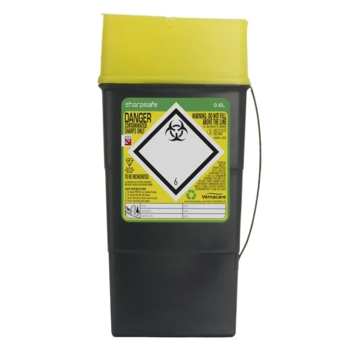 - Sharpsafe® containers are specifically designed to enable the safe disposal of clinical sharps and minimise the risk of needlestick injuries. The 0.6L has been purpose-designed for use in the community setting and fits neatly into a bag or pocket. The 0.6L is specifically shaped to contain the maximum amount of sharps in the minimum amount of space.